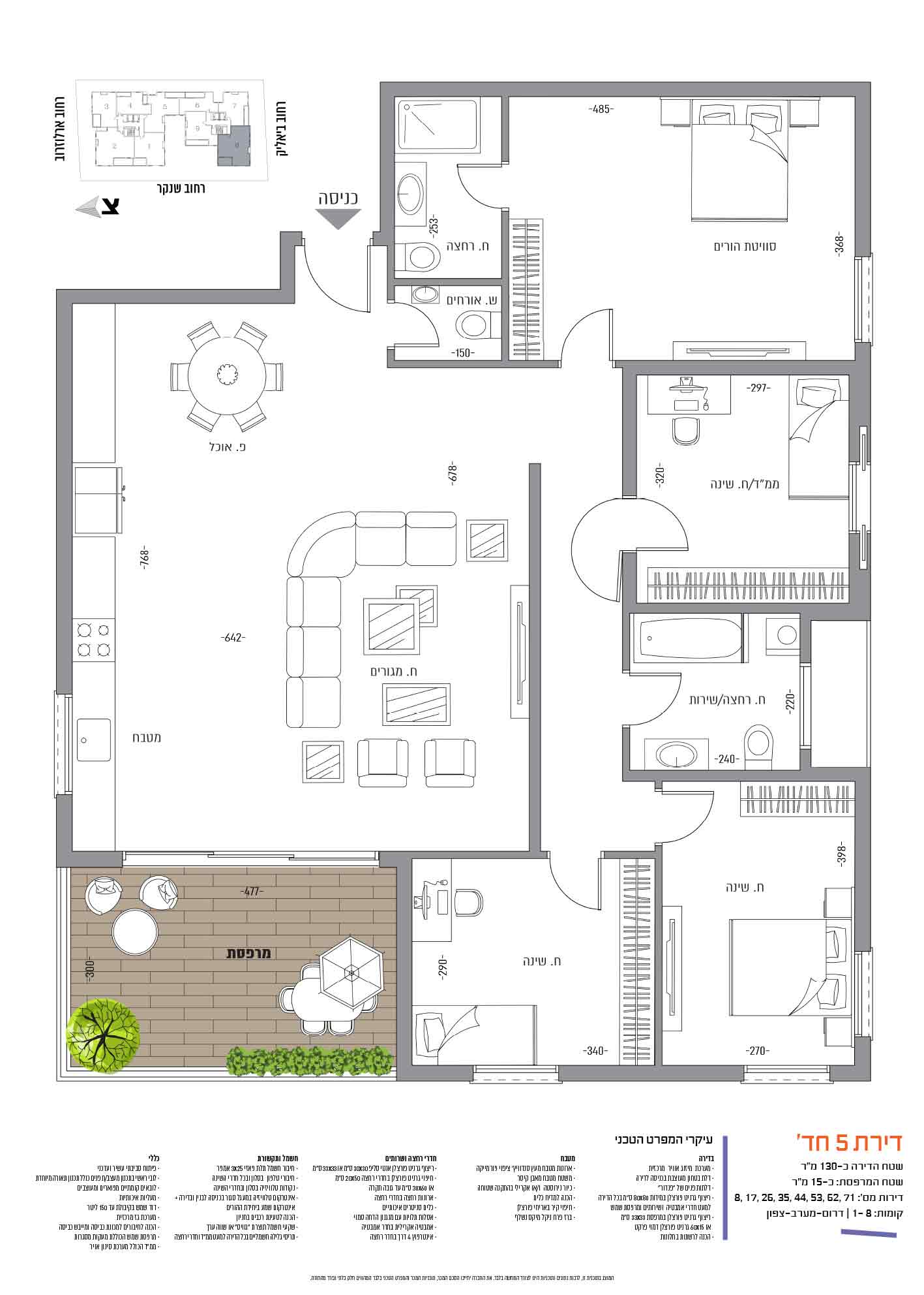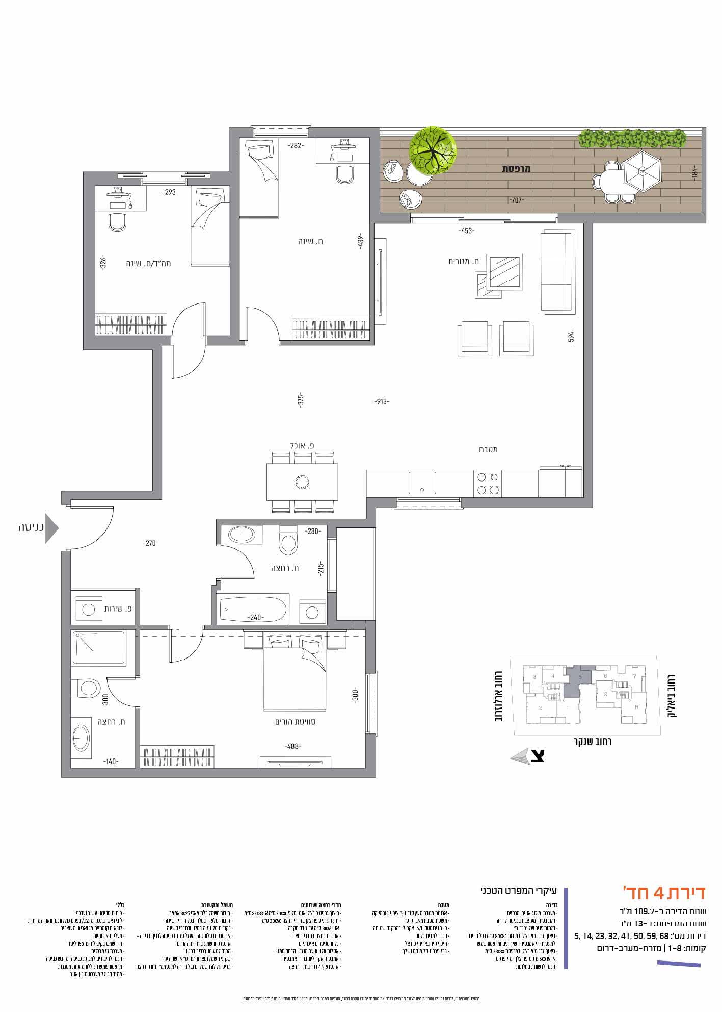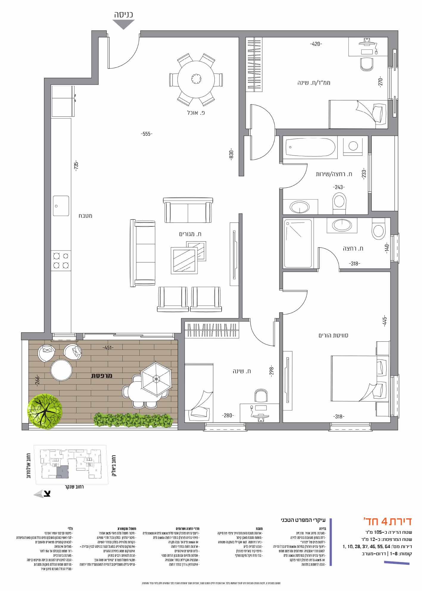 תוכניות אלו, לרבות ריהוט, אביזרים, מידות, הדמיות, הינן לצורך המחשה בלבד. לחוזה המכר מצורפים מפרט טכני ותוכניות מכר והם אלו אשר מחייבים את החברה בלבד. תוכניות אלו אינן מהוות מצג או הצעה ולא יהיו חלק מתנאי ההתקשרות/הסכם בין הצדדים. שמות המוצרים אינם סופיים. החברה רשאית להחליף עפ"י שיקול דעתה מוצר שווה ערך. | ט.ל.ח